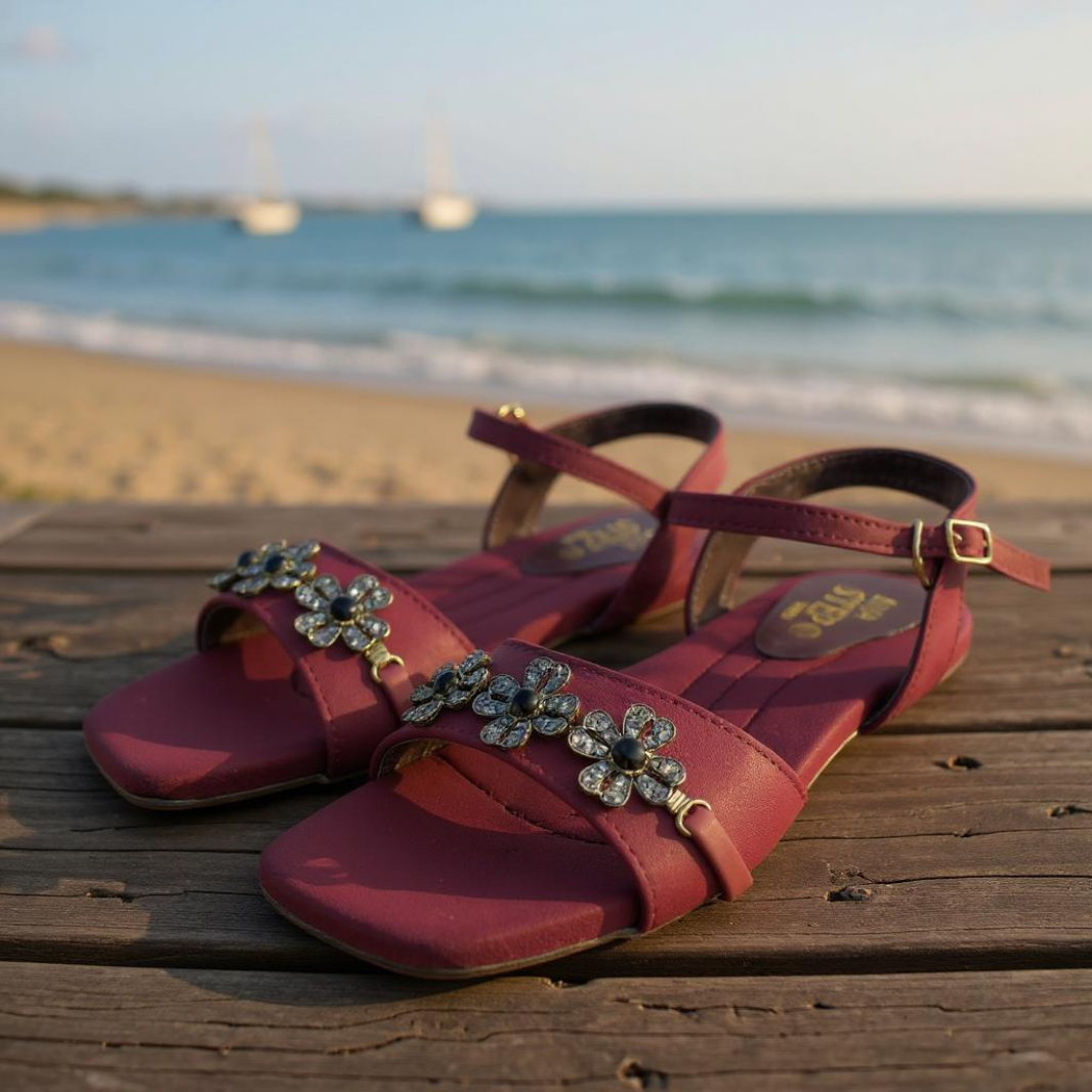 The Crimson Mehroon Flat Sandals feature exquisite antique gold embellishments that add a touch of luxury to their rich, deep crimson hue. Designed for both style and comfort, these flats offer a sophisticated look suitable for formal and casual occasions alike. Their flat sole ensures all-day wearability without compromising elegance, making them a versatile addition to any wardrobe.